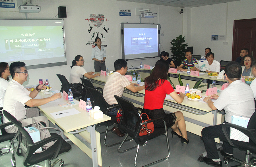 參觀期間,各位領(lǐng)導(dǎo)認(rèn)真聽取我們美女講師對(duì)方成教學(xué)一系列硬件產(chǎn)品的講解,其中包括壁掛一體機(jī)、交互式電子白板、白板一體
