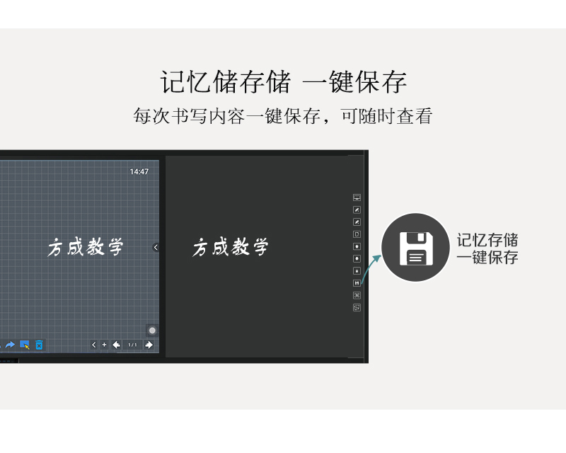 互聯黑板-記錄板書內容、再現課堂過程、轉化教學資源,板書教學記憶一體機集六大產品于一機,在不改變老師板書習慣的前提下,實現傳統教學與多媒體設備的智慧融合,設定了有板書記憶、板書同步顯示、板書自動分享等多樣化功能,每一個功能的實現都賦予了自己的使命。