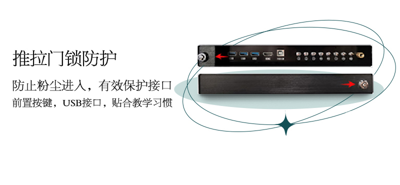 機(jī)身保護(hù)——獨(dú)特的推拉門鎖設(shè)計(jì),保護(hù)前置按鍵及接口,還能收納白板筆和教鞭;