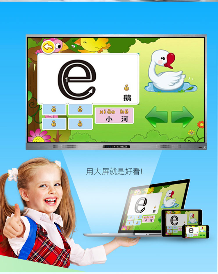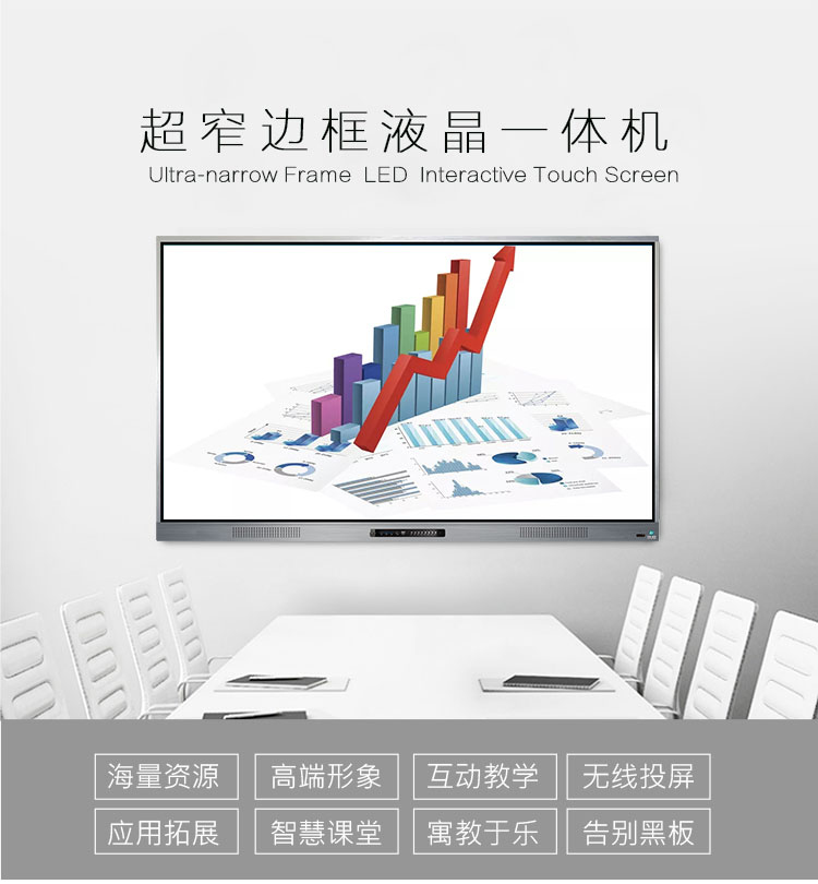 三等邊超窄邊框設計,推拉門鎖保護,4K超高清顯示,以人機交互的方式,搭載互動白板和無線投屏軟件,實現多人書寫、互聯互通的互動教學模式,豐富課堂內容,提高學習氛圍。